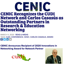 En reconocimiento a la creciente e innovadora colaboración entre la Red Nacional de Investigación y Educación en México, la Corporación Universitaria para el Desarrollo de Internet (CUDI) y la Red de Investigación y Educación de California de CENIC (CalREN), Carlos Casasús, recibe el Premio Innovaciones en Redes CENIC 2020 por R&E Network Partner. Los premios CENIC Innovations in Networking reconocen a las personas, proyectos y organizaciones ejemplares que aprovechan las redes avanzadas.