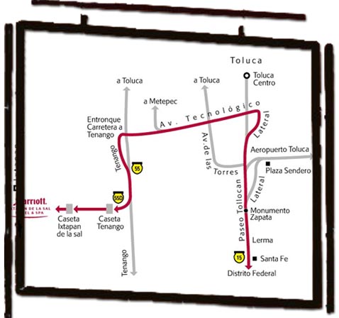 Se siguen las carreteras federales libre o de cuota número 15 a Toluca, continuando por la carretera estatal número 6 a Tenango del Valle y, finalmente, por la autopista a Ixtapan de la Sal.