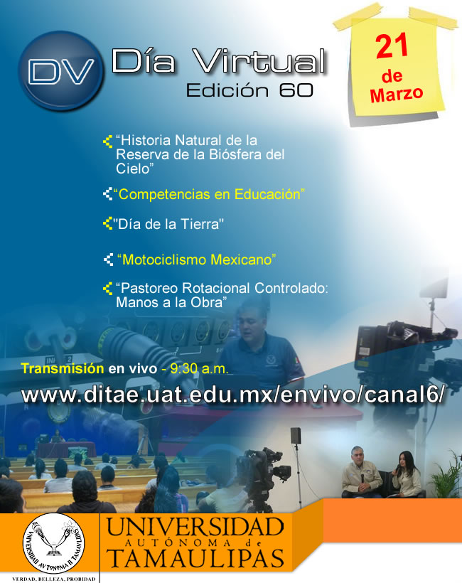 La Dirección de Tecnología de Apoyo a la Educación de la Universidad Autónoma de Tamaulipas, le invitan a participar en su "Día Virtual 60", que se llevará a cabo el jueves 21 de marzo de 09:30 hrs. a 15:00 hrs.