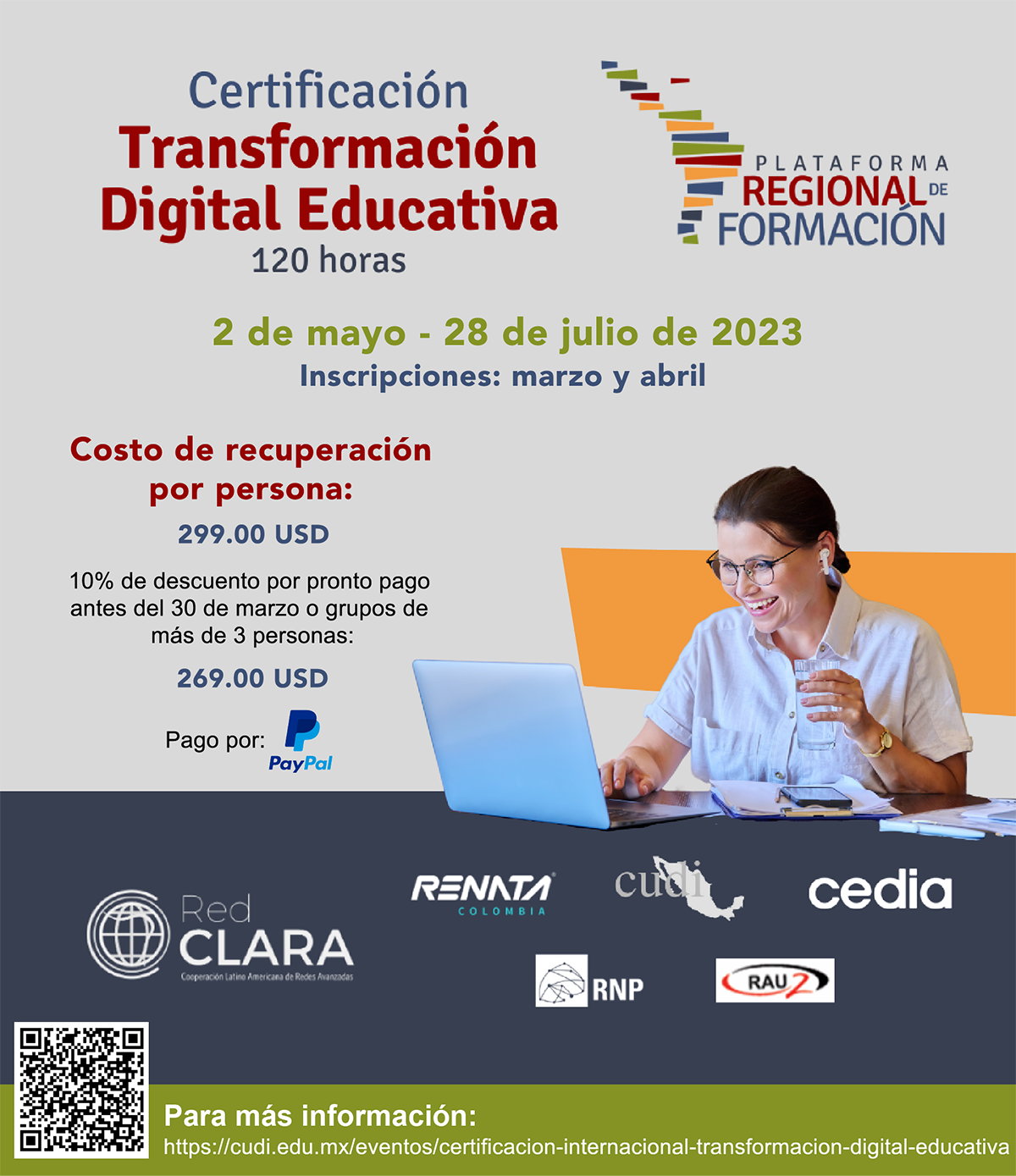 Transformación organizacional 1.1 Análisis y rediseño en la arquitectura de procesos de gestión organizacional digital 1.2 Nuevos paradigmas y mejores prácticas 1.3 Evaluación y calidad Instructor: Dr. Pedro Rocha (CUDI - RedLATE) Transformación académica2.1 Competencias y saberes para la era digital 2.2 Pedagogías emergentes y nuevas prácticas docentes. 2.3 Diseño de experiencias de aprendizaje basadas en recursos tecno-educativos Instructora: Dra. Marina Vicario (CUDI - RedLATE)