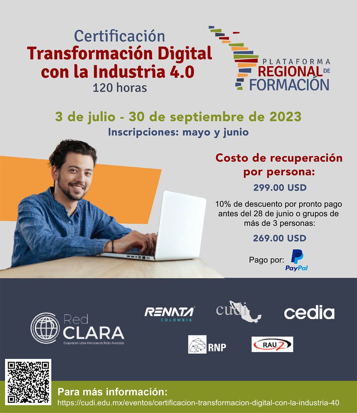 Primer módulo: Metodologías STEAM para la innovación en la industria 4.0, está a cargo de la Red Nacional de Investigación y Educación mexicana - CUDI, con una duración de 40 horas.