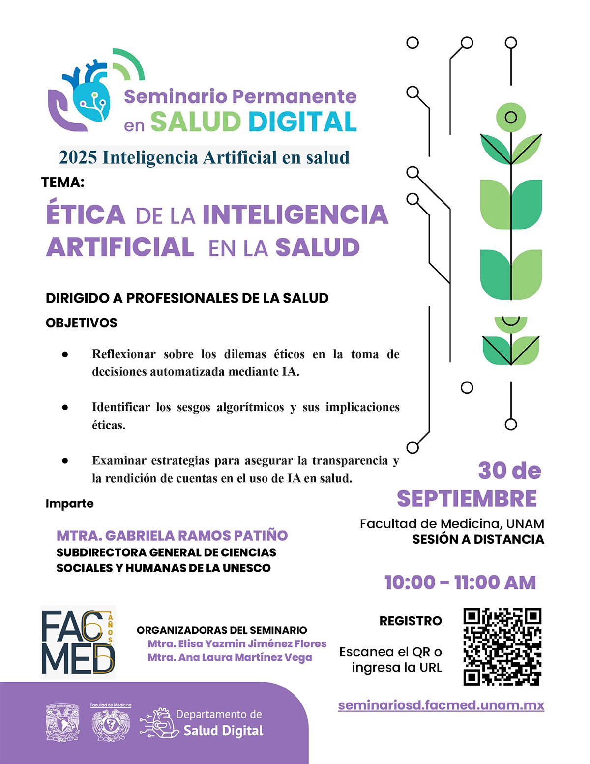 ¡Acompáñanos en la próxima sesión del Seminario Permanente en Salud Digital! Este 30 de septiembre exploraremos un tema fundamental: ÉTICA DE LA INTELIGENCIA ARTIFICIAL EN LA SALUD. De la mano de la Mtra. Gabriela Ramos Patiño, Subdirectora General de Ciencias Sociales y Humanas de la UNESCO.
