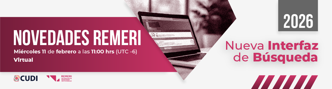 A todos los responsables de repositorios, portales de revistas y/o plataformas de recursos educativos de acceso abierto, los invitamos cordialmente el próximo miércoles 11 de febrero a las 11:00 hrs por videoconferencia, a que conozcan la nueva interfaz de búsqueda de la plataforma de la Red Mexicana de Repositorios Institucionales – REMERI, basada en el software desarrollado por LA Referencia.