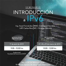 El primero de ellos, en su modalidad a distancia, fue el "Seminario Virtual IPv6" realizado en una sesión diaria de dos horas, del 27 al 29 de marzo de este año, contando con el apoyo de Azael Fernández por la UNAM, CUDI y ANUIES en donde participaron 23 Instituciones de México y más de 20 profesionales de TI, cuyos perfiles son clave, al ser los principales administradores de las redes de las instituciones participantes. Cabe mencionar que para más del 95% de los participantes, lo tratado durante el taller, fue nuevo e interesante, permitiendo aumentar su habilidad en el tema.