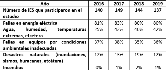 ConclusiónLos resultados de las encuestas aplicadas por la ANUIES, así como los casos compartidos por las IES, permiten identificar la necesidad de hacer visible la importancia de gestionar los riesgos asociados a la infraestructura, los centros de datos y las telecomunicaciones. Estos riesgos deben ser considerados tanto dentro de los planes de continuidad, como en la gestión de riesgos de una institución.