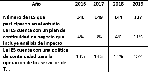 En los resultados también se observa un lento avance de las IES en la aplicación de alguna metodología de gestión de riesgos; en la implantación de planes de recuperación de desastres, y en la puesta en marcha de planes de continuidad de negocio que incluyen análisis de impacto [2]. En el cuadro 2 se presentan dos indicadores relacionados con la continuidad del negocio, que permiten ver los porcentajes de avance de las IES entre 2016 y 2019.