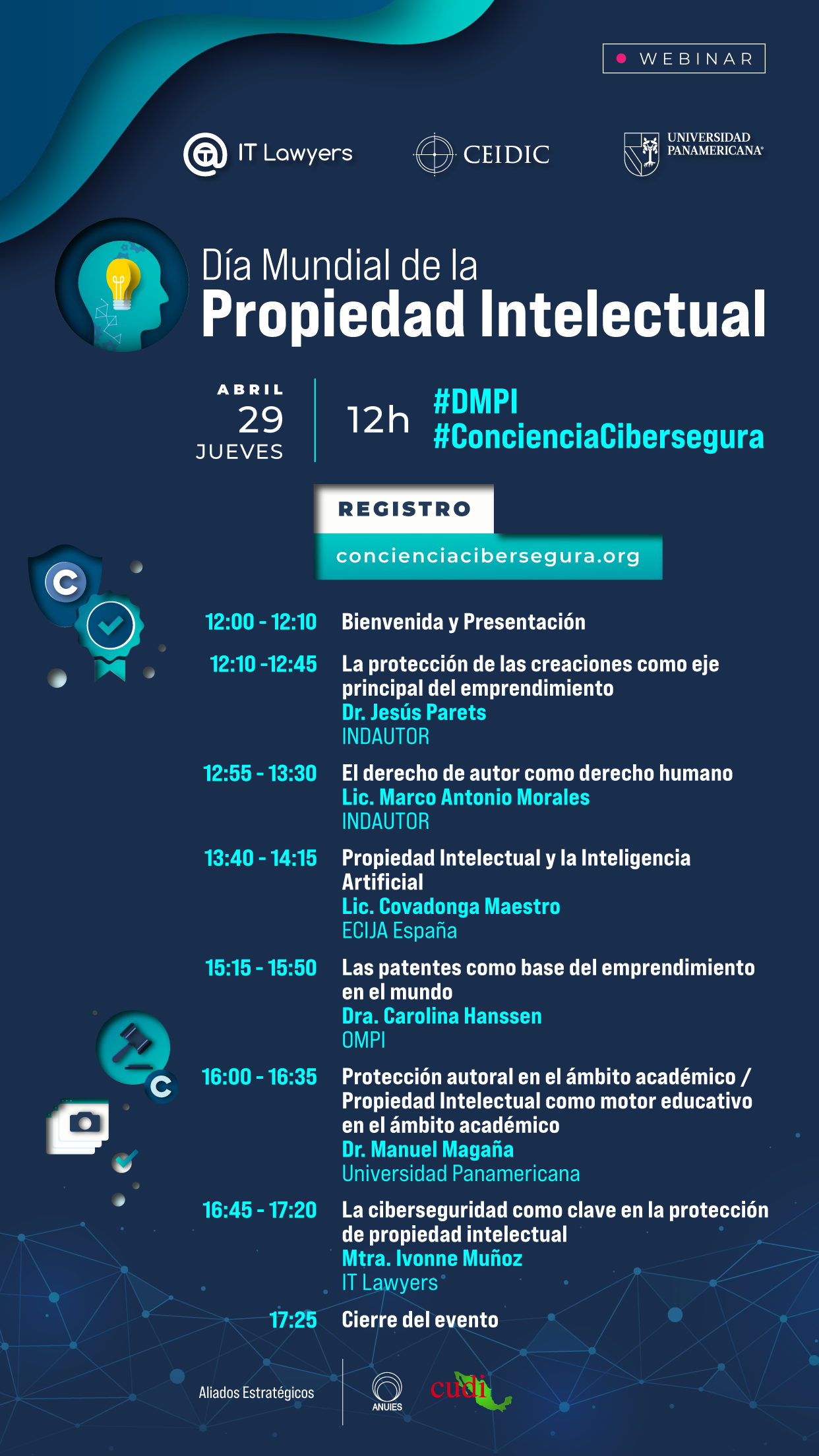 IT Lawyers, el CEIDIC y la Universidad Panamericana, sumándose al esfuerzo que desde el año 2000 la Asamblea de la Organización de las Naciones Unidas inició al declarar el 26 de abril como el Día Mundial de la Propiedad Intelectual, desarrollamos un evento especial para celebrar este próximo 29 de abril a la propiedad intelectual, con temas relacionados con el emprendimiento, delitos digitales, confidencialidad, patentes y el derecho de autor como un derecho humano.