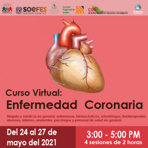 CUDI a través de su Escuela Regional de Redes (ERR), y el Hospital Regional de Alta Especialidad Ixtapaluca te invitan a participar en el curso virtual Enfermedad Coronaria dirigido a médicos en general, enfermeras, farmacéuticos, odontólogos, fisioterapeutas, residentes, internos, alumnos, psicólogos y personal de salud en general.