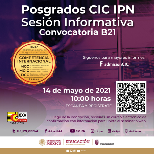 Sesión informativa para ingresar a los posgrados del Centro de Investigación en Computación del Instituto Politécnico Nacional para el semestre 2021 B, dentro de las redes sociales y portal de la Corporación Universitaria para el Desarrollo de Internet A.C., en la cual llevas el área de comunicación muy dignamente.
