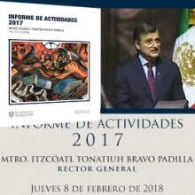 El Mtro. Itzcóatl Tonatiuh Bravo Padilla, Rector de la Universidad de Guadalajara se presentó el pasado 8 de febrero ante el Consejo General Universitario a rendir cuentas sobre su gestión anual 2017. Lo que informó es el resultado del trabajo y compromiso de una comunidad de 307 mil 826 universitarios, integrada por 280 mil 297 estudiantes, 16 mil 881 académicos y 10 mil 648 trabajadores universitarios.